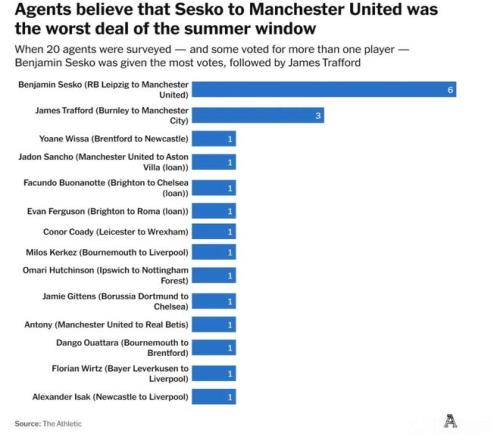 该媒体询问了20位经纪人,让他们选出今夏最差引援,其中一些人投了不止一名球员。最终,谢什科获得了6票,是所有球员中最多的,而排名第二的则是曼城门将特拉福德,他只有3票。其余被提到的球员还有吉滕斯、维萨、约克雷斯、维尔茨等。其中,备受争议的维尔茨,仅拿到1票。