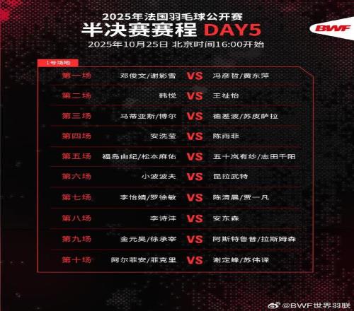 北京时间10月25日凌晨,法国羽毛球公开赛1/4决赛全部结束,国羽在本日取得7胜1负的战绩。