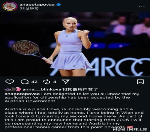 2025年12月4日,波塔波娃宣布加入奥地利国籍,2026赛季将代表奥地利参与网球赛事。这一消息像一颗投入湖面的石子,激起的涟漪却远超出体育版面的范畴。她不是第一个,也不会是最后一个——卡萨金娜转身拥抱澳大利亚的阳光,格拉乔娃在红土场上为法国而战,拉希莫娃选择乌兹别克斯坦的红蓝旗帜。一场静默的“蒲公英迁徙”正在女子网坛上演,每一片飘散的种子背后,都藏着当代运动员在政治与职业夹缝中的生存哲学。