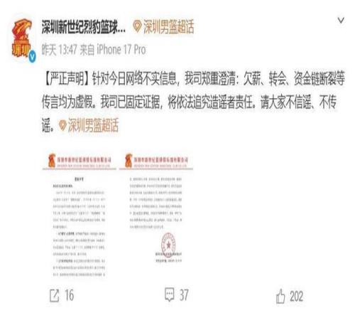 深圳队本赛季战绩不错,目前8胜6负的战绩排名联赛第八,近期还分别战胜了北京首钢、上海队、青岛队等强队,目标直指季后赛,这其中不仅有球员的连续爆发,更大的功劳在于老帅郑永刚指导。不过近期有传闻深圳队出现“球员欠薪、球队可能会交易球员,甚至有球队(俱乐部)资金链断裂,面临破产”等信息,搞得人心惶惶的,对于这些问题深圳市新世纪篮球俱乐部有限公司做出了官方回应。