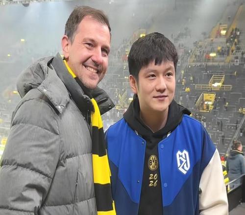 樊振东在社媒发布动态。他与德国名将波尔又一起观看了足球比赛,并与多特蒙德的主帅合影。樊振东谈笑风生,非常开心。